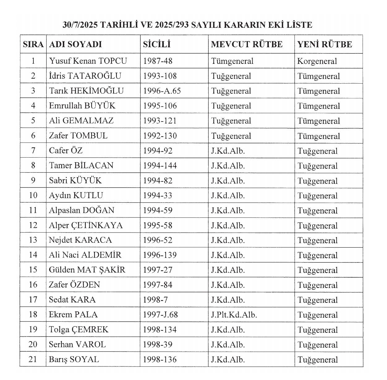 Ekli listede yer alan Jandarma Genel Komutanlığına mensup generaller ve albaylar, 30 Ağustos 2025 tarihinden geçerli olmak üzere, 3 sayılı Cumhurbaşkanlığı Kararnamesinin 10 ve 11 inci maddeleri gereğince bir üst rütbeye terfi ettirilmiştir.