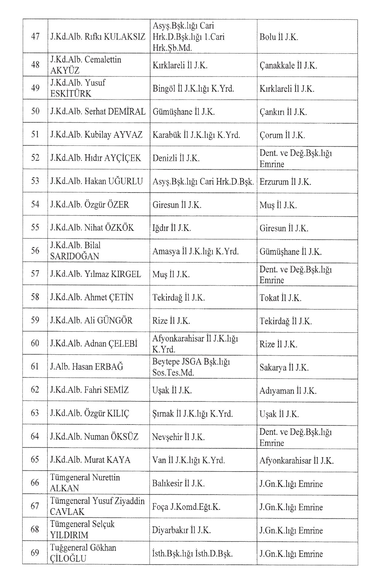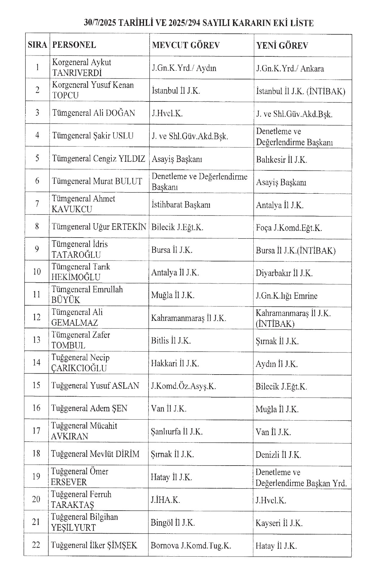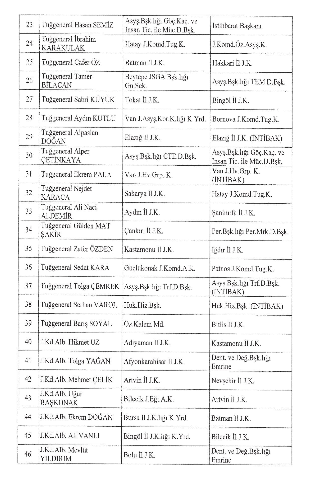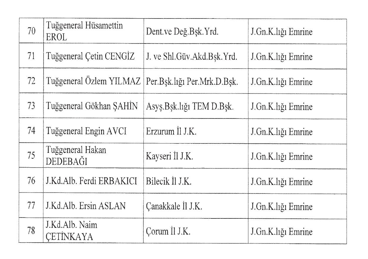 Ekli listede yer alan Jandarma Genel Komutanlığına mensup generaller ve albaylar hizalarında belirtilen görevlere, 3 sayılı Cumhurbaşkanlığı Kararnamesinin 11 inci maddesi gereğince atanmıştır.