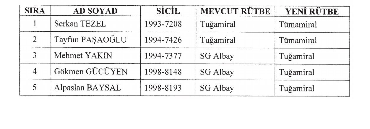 Listede yer alan Sahil Güvenlik Komutanlığına mensup 2 amiral ve 3 albay, 30 Ağustos 2025 tarihinden geçerli olmak üzere, 3 sayılı Cumhurbaşkanlığı Kararnamesinin 10 ve 11 inci maddeleri gereğince bir üst rütbeye terfi ettirilmiştir.
