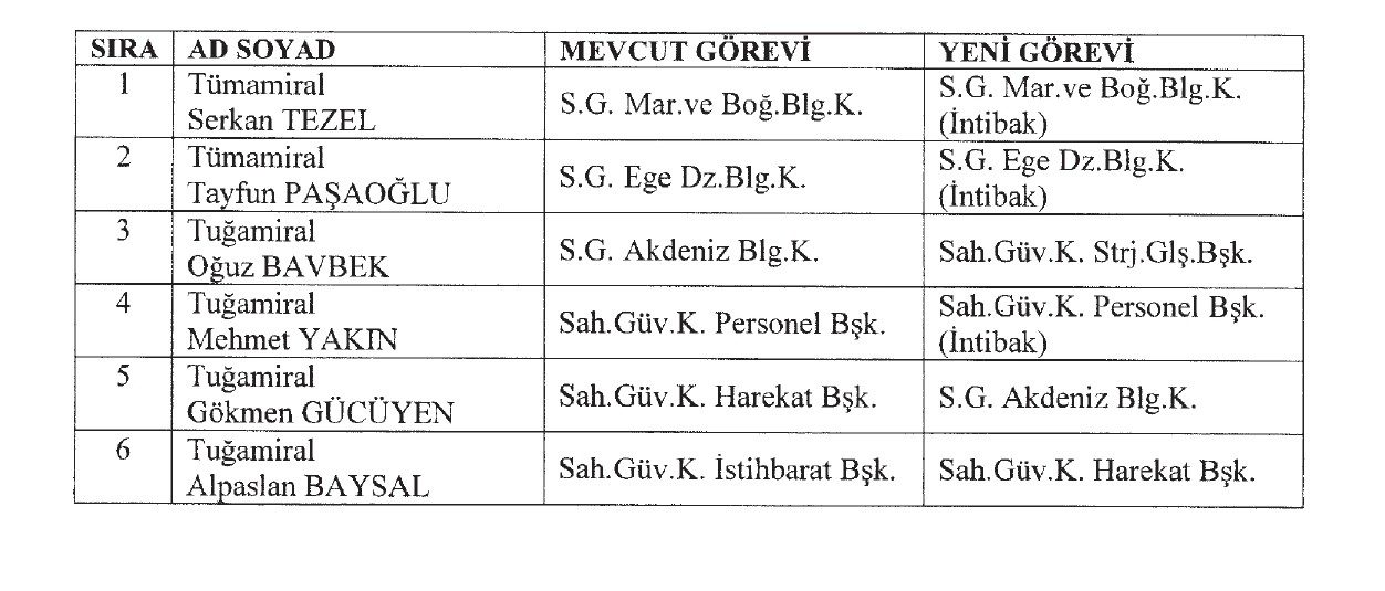 Listede yer alan Sahil Güvenlik Komutanlığına mensup amiraller hizalarında belirtilen görevlere, 3 sayılı Cumhurbaşkanlığı Kararnamesinin 11 inci maddesi gereğince atanmıştır.