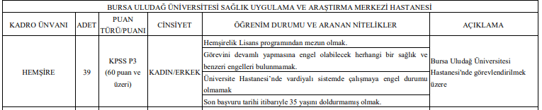 “Sözleşmeli Personel Çalıştırılmasına İlişkin 06.06.1978 tarihli ve 7/15754 sayılı Bakanlar Kurulu Kararı ile yürürlüğe konulan “Sözleşmeli Personel Çalıştırılmasına İlişkin Esaslara” göre 657 sayılı Devlet Memurları Kanununun 4. maddesinin (B) fıkrası uyarınca, giderleri Özel Bütçeden karşılanmak üzere Bursa Uludağ Üniversitesi Hastanesi’nde görevlendirilmek üzere 2022 KPSS (B) grubu puan sıralaması esas alınmak suretiyle aşağıda belirtilen pozisyonlarda toplam 50 (elli) adet sözleşmeli personel yerleştirmesi yapılacaktır.